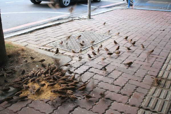 我們在享用早餐時,顆小比當然也有分到一杯羹,但是她更想跟店家門口的麻雀群玩