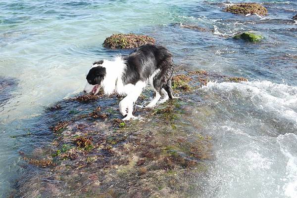 西西一開始很緊張,但後來發現站在礁岩上讓海浪沖沖很涼,後來就趴著讓海浪沖屁股