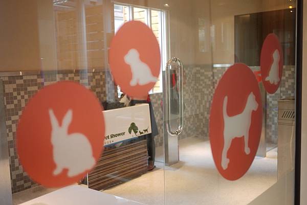 用貼有動物圖案的玻璃門隔開咖啡區跟寵物美容區
