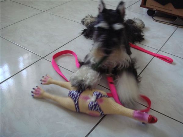 看這臭狗還給我一邊吃潔牙骨一邊玩橡皮雞